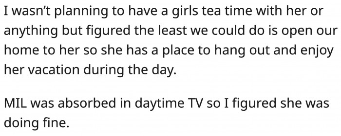 OP’s husband called out her ridiculousness, which made her more upset and fueled her to plot again. One day, when the husband wasn’t around, the MIL was sitting on their couch, immersed in watching daytime TV.