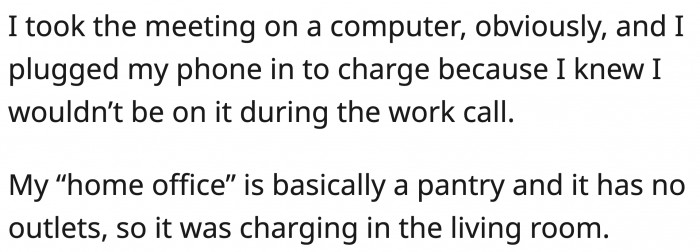 OP took this opportunity to take a work call in her makeshift home office while she waited for her phone to charge in the living room. The Zoom call was going okay; it was between her and the five guys she worked closely with.