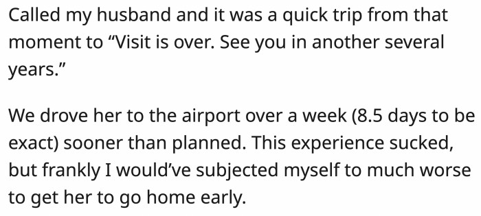 OP’s husband found out and cut his mother’s trip short. They drove her to the airport and immediately said goodbye.