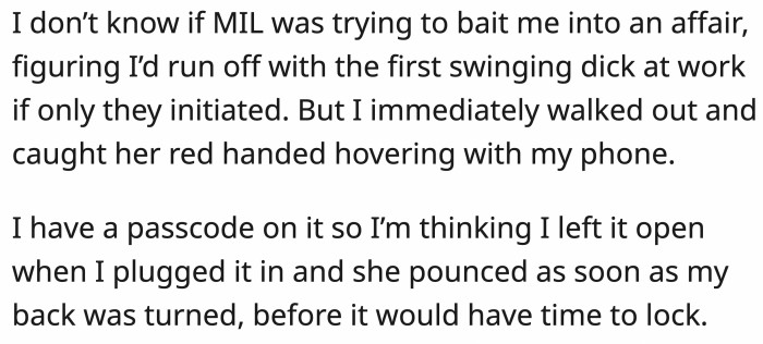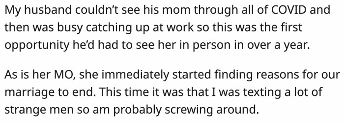 Until she decided to visit because she hadn’t seen OP’s husband throughout the pandemic. The MIL immediately had a mission to prove that OP was cheating since she was allegedly texting ‘strange men.’