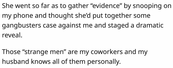 The MIL snooped on OP’s phone and gathered what she thought was evidence, which she presented to OP’s husband. It turned out that those ‘strange men’ were all OP’s co-workers, and her husband was already familiar with them.