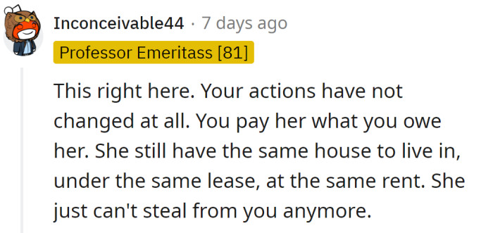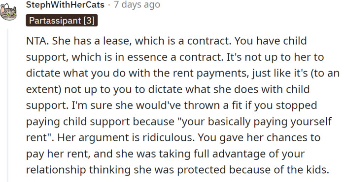 RedditThe OP explained his ex and their children live in his house, he pays child support, and she pays him rent: