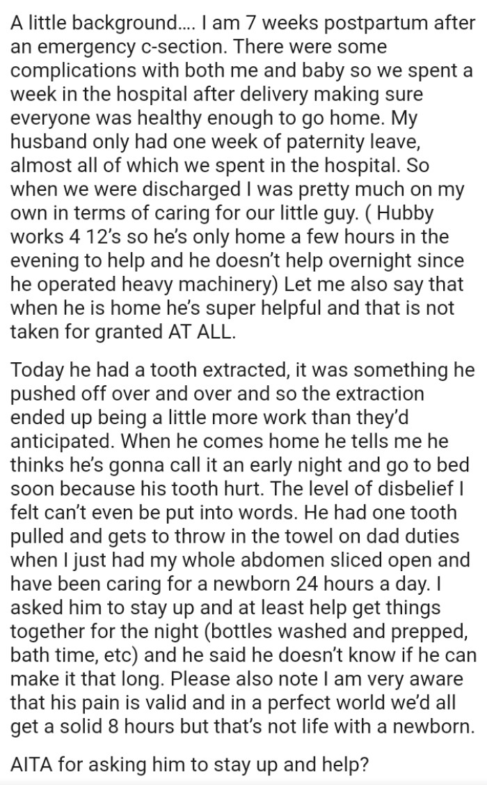 Asking my husband to stay up and help with the babyHe just had a tooth extractedThe OP also added an edit saying: