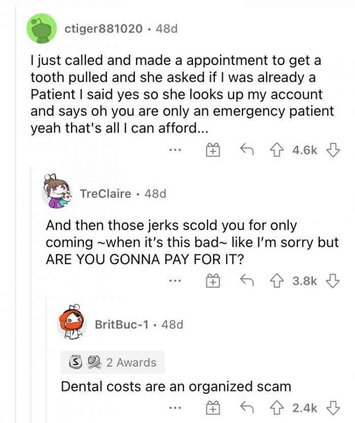 4. You can't afford regular dental work, so you end up spending more to fix everything that was neglected