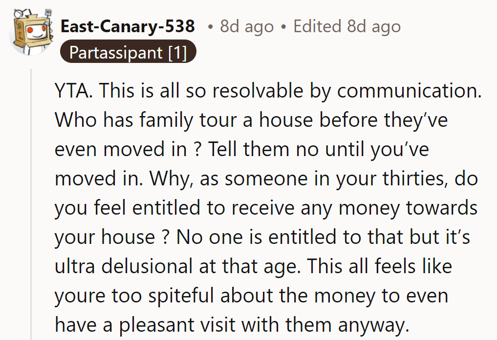 RedditFamily pressures them financially for visits despite no contribution, causing tension over the new home.