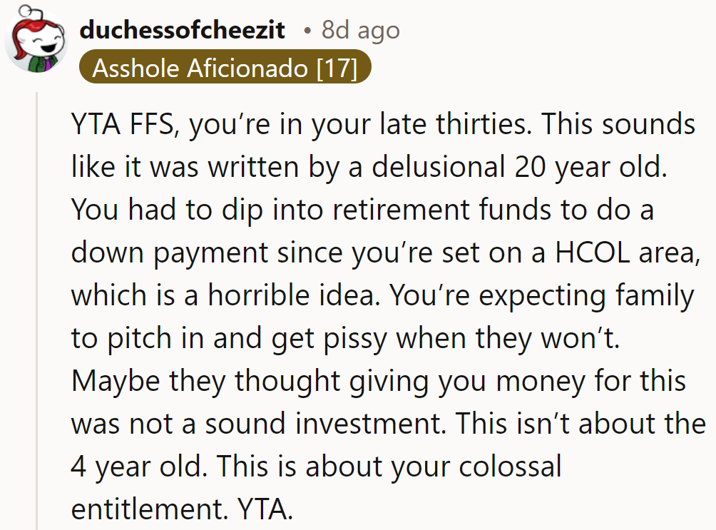 "Risky retirement move, entitled vibes. It's not about the 4-year-old; it's about entitlement.