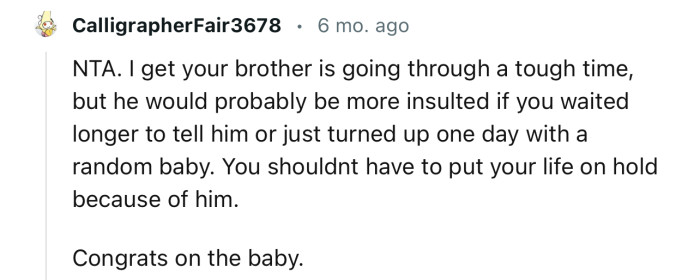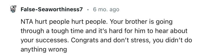 The Reddit community has rallied behind OP to give her the much-needed support. The commenters feel that she doesn’t need to pause her life or keep her successes a secret because of what her brother is going through.