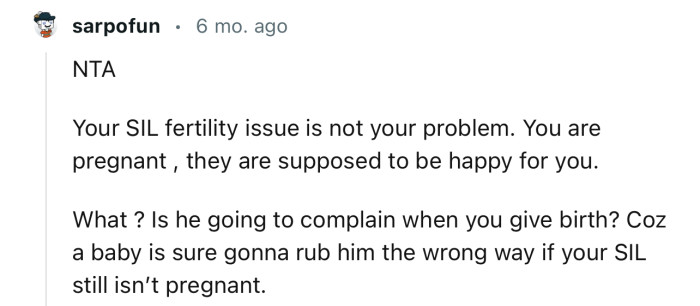 "Your SIL's fertility issue is not your problem. You are pregnant; they are supposed to be happy for you."