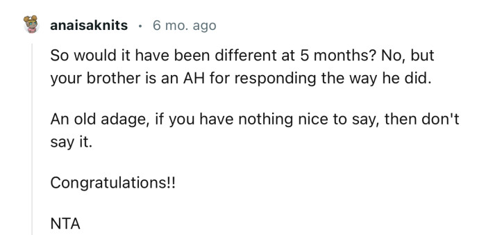 OP's brother's reaction cut deep into her heart. With the ever-present risk of a miscarriage due to some health issues, OP didn't want to offend any family member so that she could have emotional support if the worst happened.