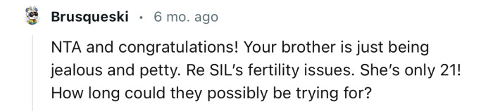 Reddit.comOP’s brother accused her of rubbing it in their faces since he and his wife were struggling to conceive