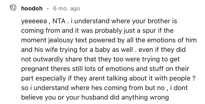 However, instead of the anticipated joyous reactions, OP's announcement was met with disapproval and resentment from her brother. The underlying issue? Her brother and sister-in-law have been struggling to conceive for a long time.