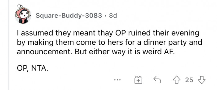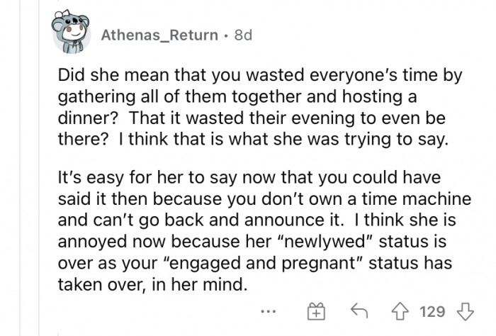 Reddit/aitapostpregnantThe Redditor waited until a month after the wedding to make the announcement at a family dinner that she hosted.