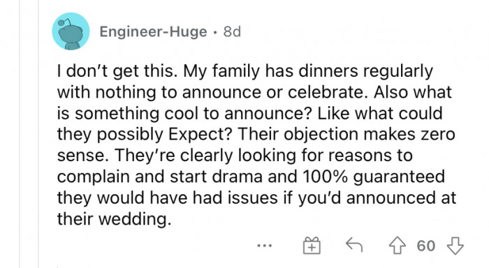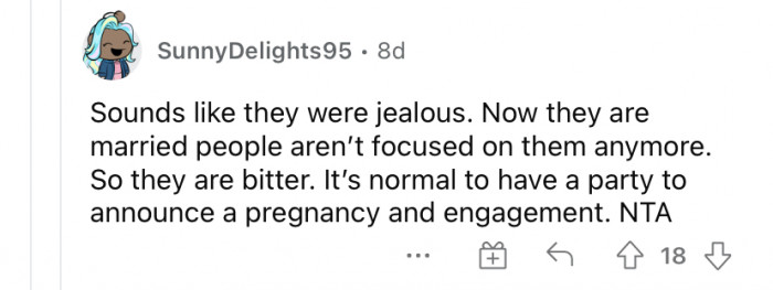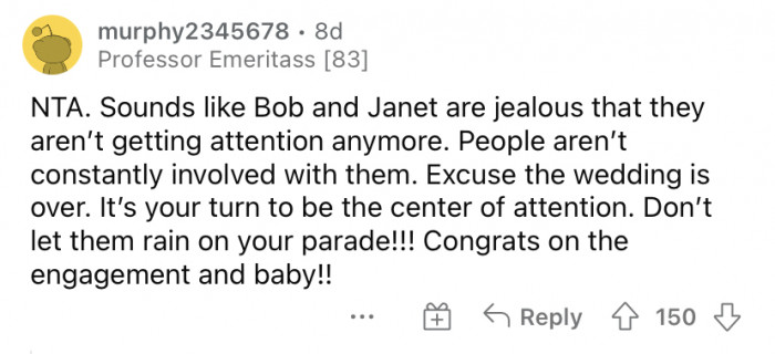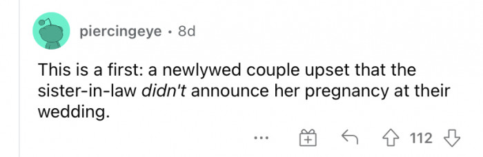 You see, at the time of the Redditor's brother and sister-in-law's wedding, she had recently found out that she was pregnant. The OP was excited to tell her family the happy news but knew that it wasn't considered appropriate to make such an announcement at a wedding, so she didn't.