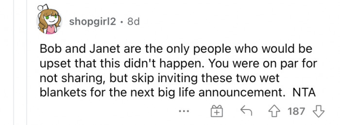 The couple asked the OP why she didn't announce the pregnancy at their wedding. She explained that she didn't want to overshadow them in any way on their special day, but they said they were disappointed that she didn't.