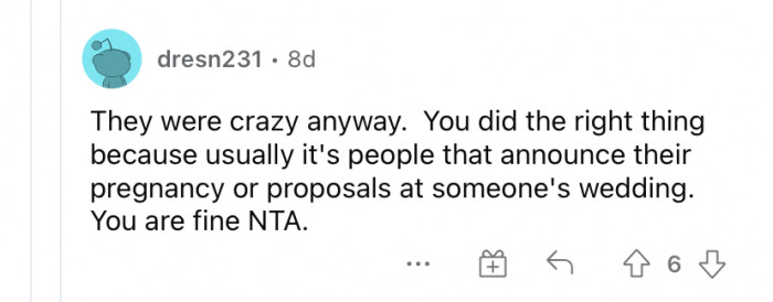Reddit/aitapostpregnantThe Redditor's brother and his new wife asked the OP why she didn't announce the pregnancy at their wedding. She explained that she didn't want to overshadow them in any way on their special day, but they said they were disappointed that she didn't.