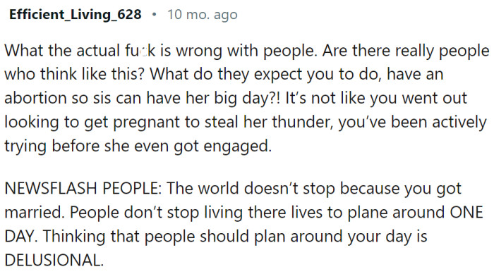 They argue that OP took reasonable steps to consider her sister's special day and that getting pregnant isn't a perfectly timed process. Read the full story below: