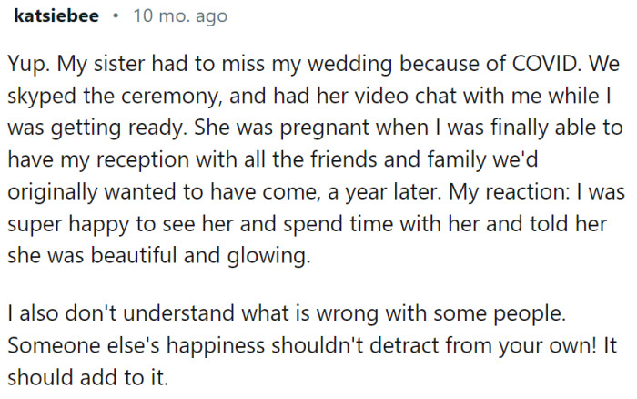 When she informed her sister of the pregnancy, expecting happiness, she was met with anger and accusations of stealing her thunder. Reddit users have varied opinions on the matter.