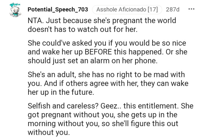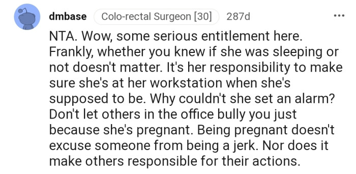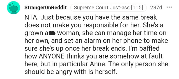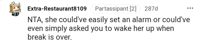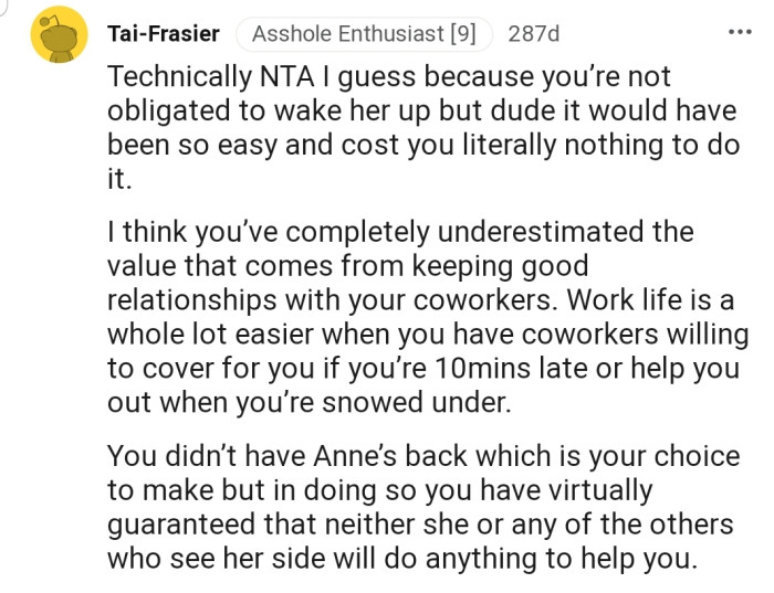 The commenters also wondered why Anne couldn't just set an alarm or specifically ask OP to wake her up. Regardless, a few Redditors scolded OP for not looking out for her colleague.
