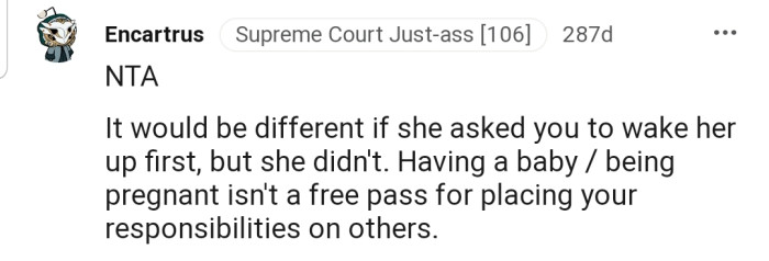 "Having a baby / being pregnant isn't a free pass for placing your responsibilities on others."