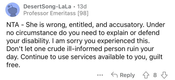 Reddit user u/PossibilityJaded7682 recently shared a story in the AITA (Am I The A**hole?) subreddit about their experience in this exact situation. The OP explained that they have a disability that makes walking for long periods very painful.
