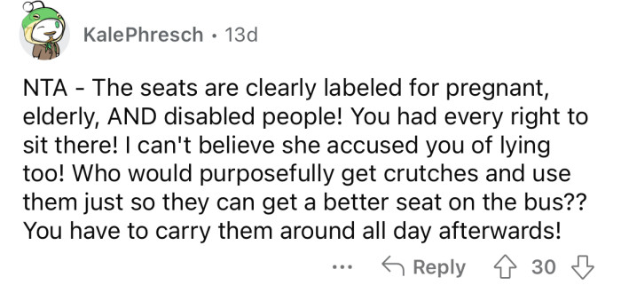 When the OP got on the train, another passenger was kind enough to offer them their priority seat. As the train started to fill up, a woman approached the Redditor, stuck out her belly, and demanded that they give up the seat because she was pregnant.