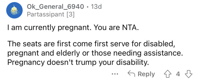 The OP says the woman didn't have an obvious bump, so they are unsure if she really was pregnant or not. But when the OP explained that they were disabled and needed the seat, the woman wasn't happy.