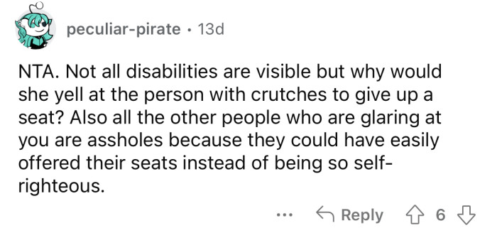 Standing nearby, the woman called a friend and started to complain loudly about kids these days who are "faking disabilities" to get a seat on the train. The OP felt uncomfortable as people glared at them, making them feel guilty for not giving up their seat.