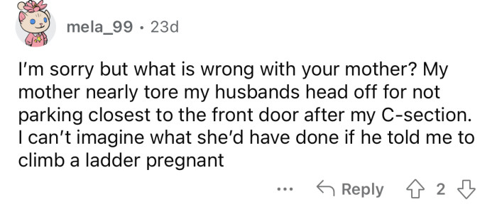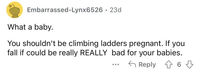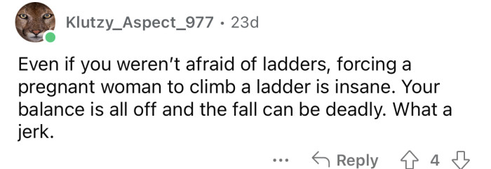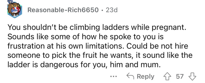 When they got outside, the OP's stepfather announced that he would go and get the ladder. When the Redditor said she didn't feel comfortable climbing a ladder while pregnant, he cut her off and told her to "stop being dramatic."