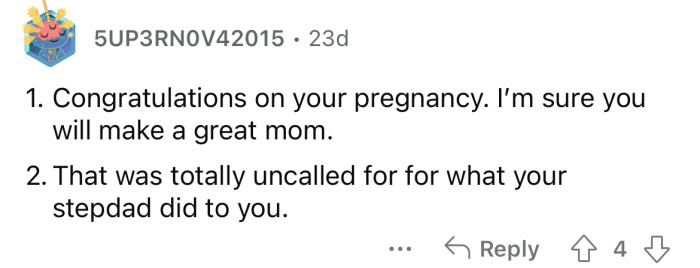 The OP says her stepfather has since texted her with an apology, but she has not responded yet. Keep scrolling to see how people reacted.