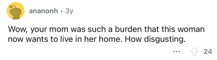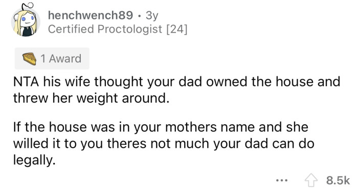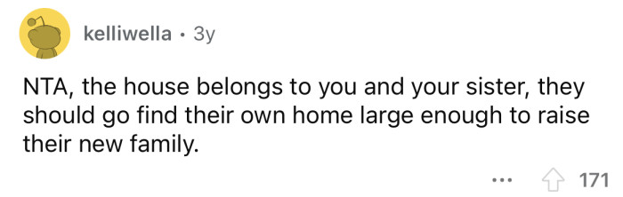 Reddit/Pitiful-HeronShe explained that her mother sadly passed away three years ago, and the family home was left to her in the will while the family's vacation home was willed to her 16-year-old sister.