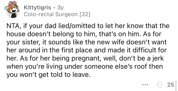 Now seven months pregnant, the stepmom had no idea that the house belonged to the OP. Her father called the OP "cruel" for kicking a pregnant woman out and said he wants to challenge her mother's will.