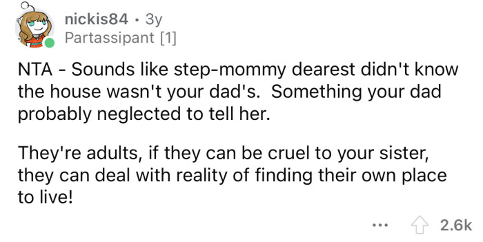 She then told OP's sister to leave and go to stay with her aunt. When the OP found out about the exchange, she was furious and told her dad and stepmom they would need to leave the family home within a week.