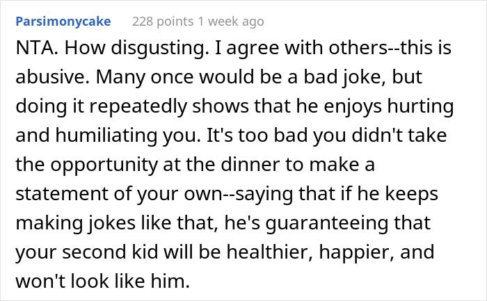 To add insult to injury, her husband made a tasteless "joke toast" that embarrassed her in front of numerous guests. Naturally, the original poster was appalled by her husband's statement and the reaction of the people toward the joke.