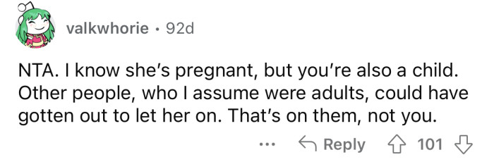 The next morning, the pregnant woman called the OP an a**hole in front of her mother, and the Redditor got in big trouble. However, the OP says she doesn't believe she did anything wrong.