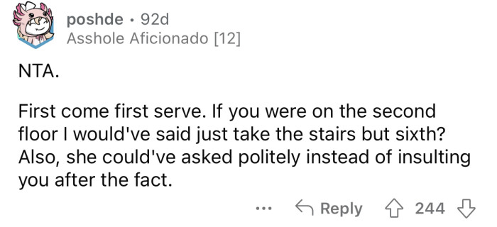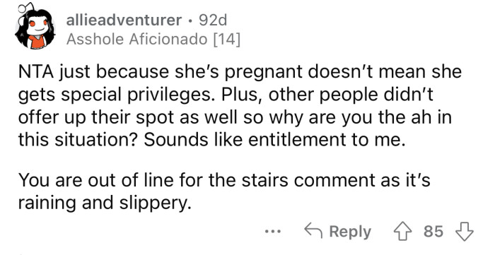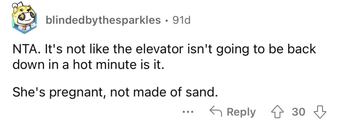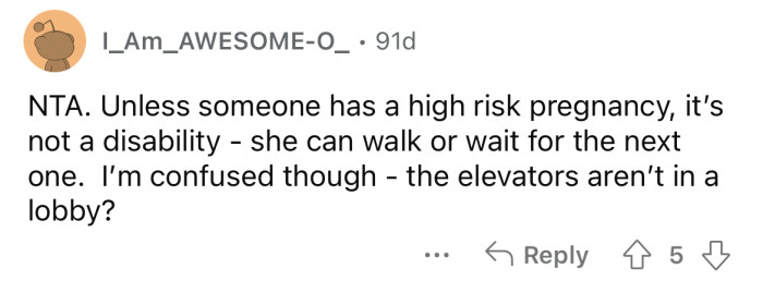 What's your take on this situation? Do you think the OP was wrong for not allowing the pregnant woman to go ahead of her, or was she just as entitled to take the last spot in the elevator?