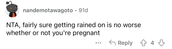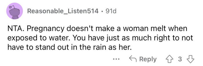 The OP asked if she's an a**hole for making a pregnant lady wait in the rain.