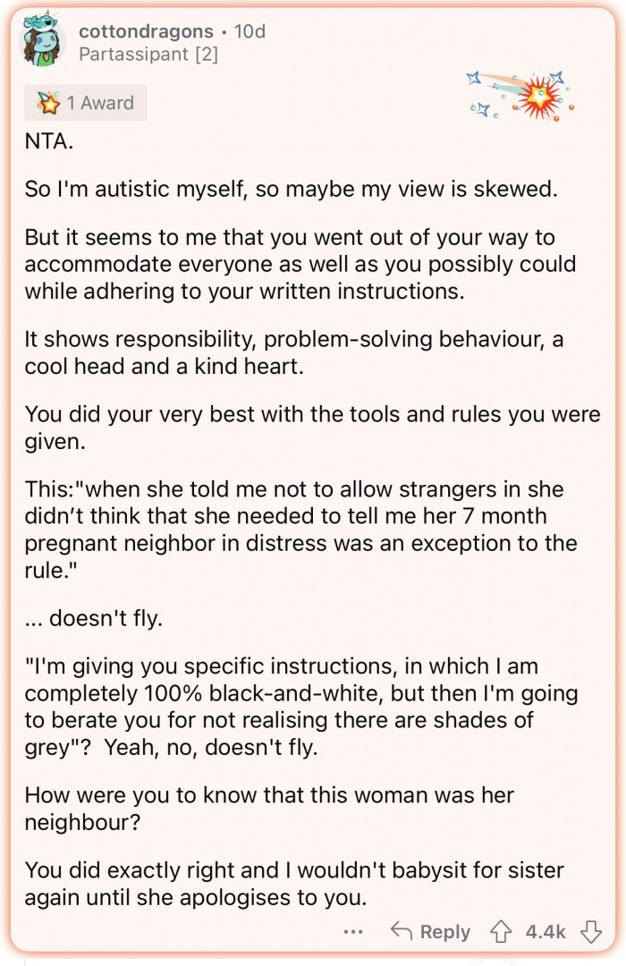 A Redditor who goes by the username u/Little_Prompt_9887 made a post on the r/AmItheA**hole subreddit, where she explained how she refused to let a pregnant stranger into her sister's house. The user has autism and was given explicit instructions not to allow any strangers in, but she still doubted how she handled the situation.