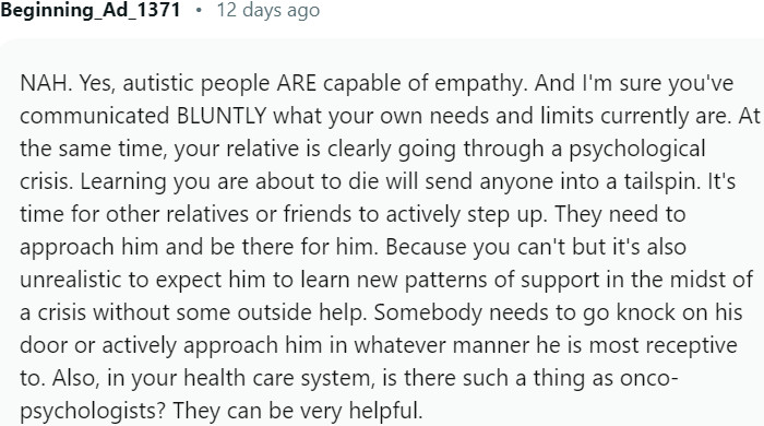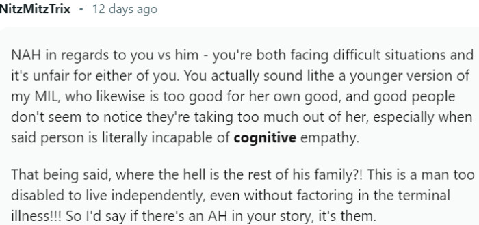 In the case of OP, a distant relative of her husband's family, she has been helping a family member with autism and various health problems. The family member has become highly dependent on OP and her husband for assistance, especially after being diagnosed with untreatable cancer in its end stages.