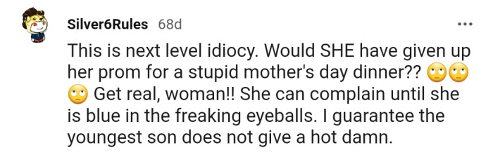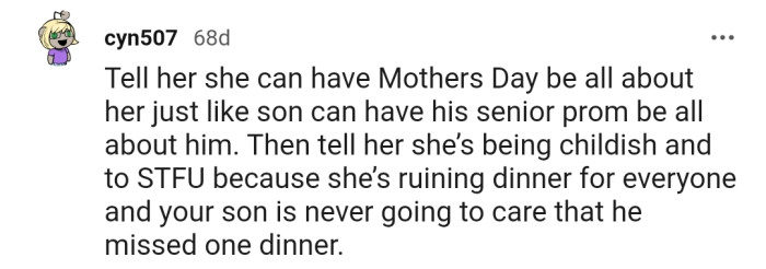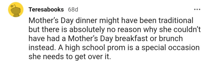Although OP explained to her that the senior prom was an experience their son would only enjoy once in his lifetime, while Mother’s Day was a recurring event, she still wouldn’t budge.