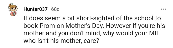 Reddit.comOP's son has chosen his senior prom over Mother's Day, and their MIL is not happy about it