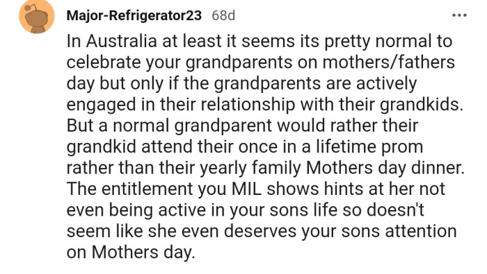 This is why many Redditors understand OP’s son’s decision to miss the Mother’s Day dinner, and they believe OP’s MIL should understand this too.