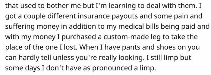 Her car was totaled; the accident mangled her left leg, which had to be amputated, and she also lost some fingers in the incident. With the money she received from insurance, OP got herself a prosthetic leg.