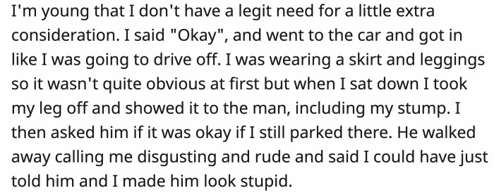 OP showed her prosthetic leg and her stump to the man. She asked him if it was acceptable now for her to stay in the parking spot.