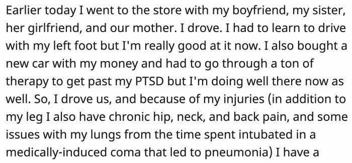 Recently, she drove to the store with her mom, her boyfriend, her sister, and her sister's girlfriend. OP gets easily fatigued when she has to walk a long distance; therefore, she parks in the handicapped space to be closer to the entrance.