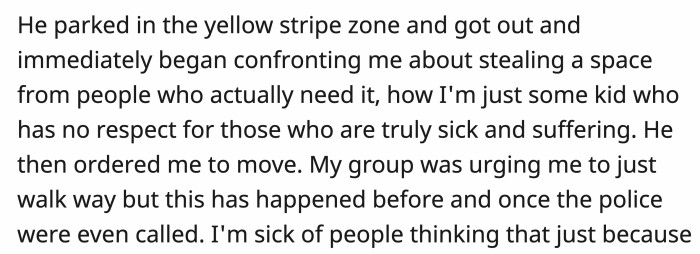 He told OP to move, and her family urged her to walk away from the confrontation. However, this isn't the first time this has happened, and OP is tired of people assuming that she's entitled because she's young.