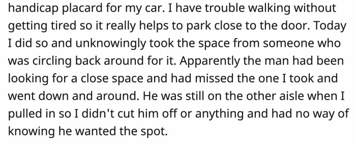 OP didn't know that someone else was circling back to park in the handicapped spot until the man stopped in the yellow-striped zone to confront her. He scolded OP for taking the spot dedicated to those who actually need it, not realizing that OP needed it herself.