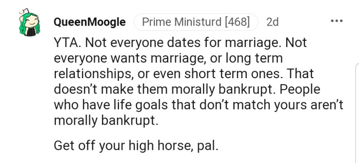 "YTA. Not everyone dates for marriage. Not everyone wants marriage, or long-term relationships, or even short-term ones."