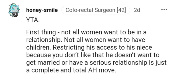 "Restricting his access to his niece because you don’t like that he doesn’t want to get married or have a serious relationship is just a complete and total AH move."