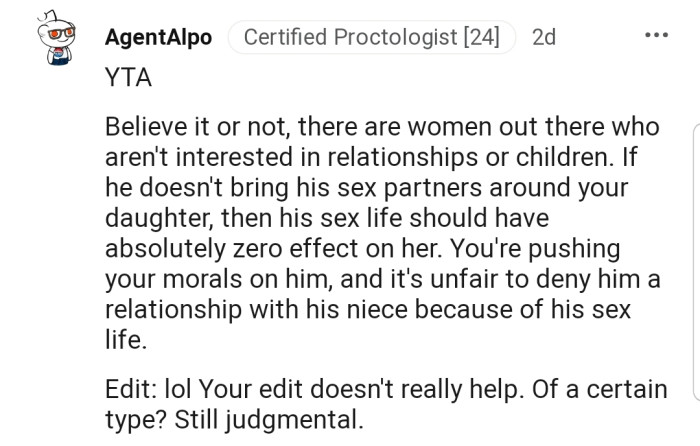 "You're pushing your morals on him, and it's unfair to deny him a relationship with his niece because of his sex life."