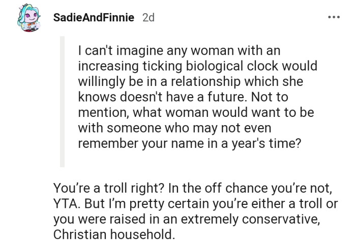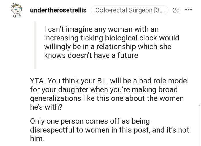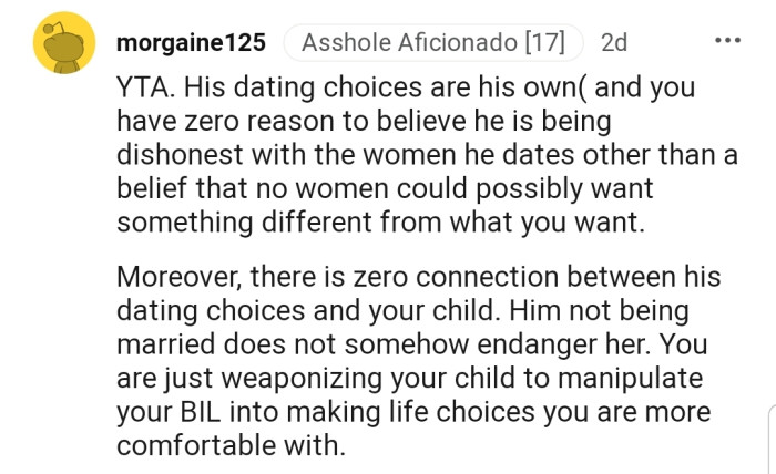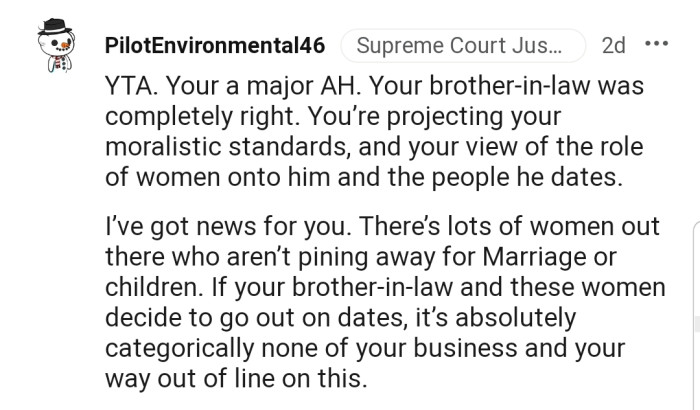 Her reason for this was her brother-in-law’s dating choices. According to OP, he has no intention of getting married or having kids and only dates for sexual reasons, which bothered her so much that she once mentioned it to him.